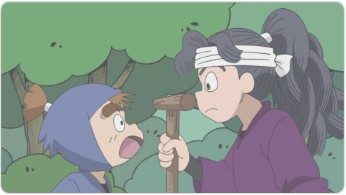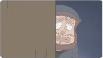 도구 관리 주임 요시노 선생님이 나무 그늘에서 코마츠다씨의 상태를 보고있었다. 얼빠진 코마츠다씨가 실수하면 바로 주의를 주기 위해 보고 있는건가 하고 란타로들은 생각하지만...