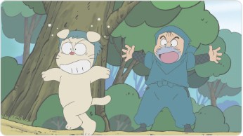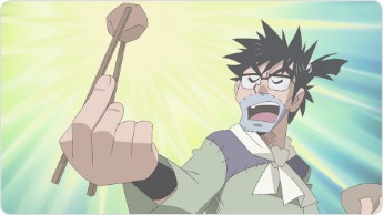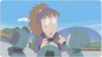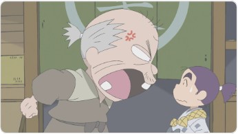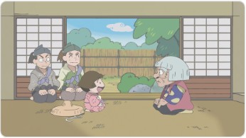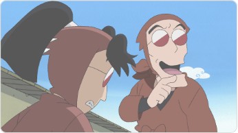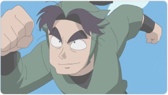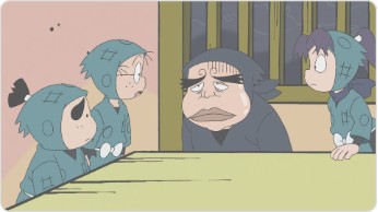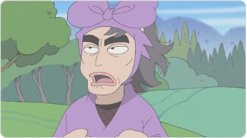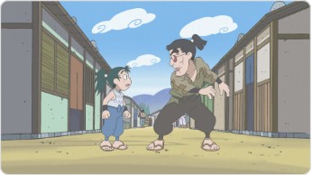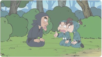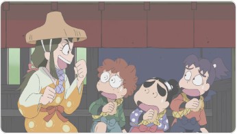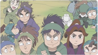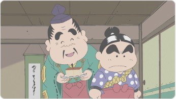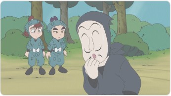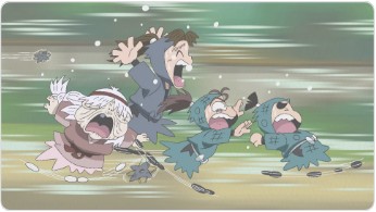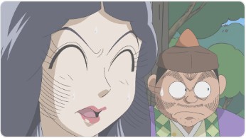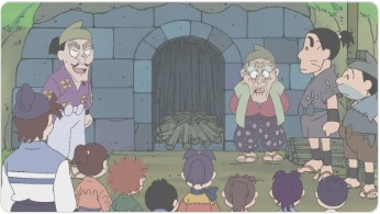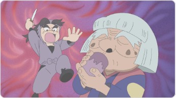 | 저택에 숨어 있던 도적단의 요코구루마 오시에몽들에게 보물의 존재가 쓰여진 암호문을 빼앗길 뻔한 란타로들. 그 때, 신베의 엉덩이에서 벗어나지 않던 통이 엄청난 기세로 튕겨져 나갔다. |
